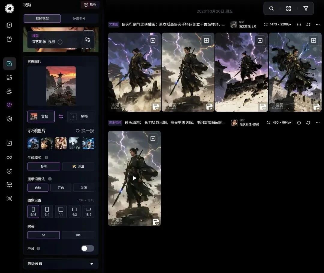 平台支持文生视频和图生视频两种模式,可设置视频比例、时长(5秒/10秒)、背景音乐、镜头效果等。