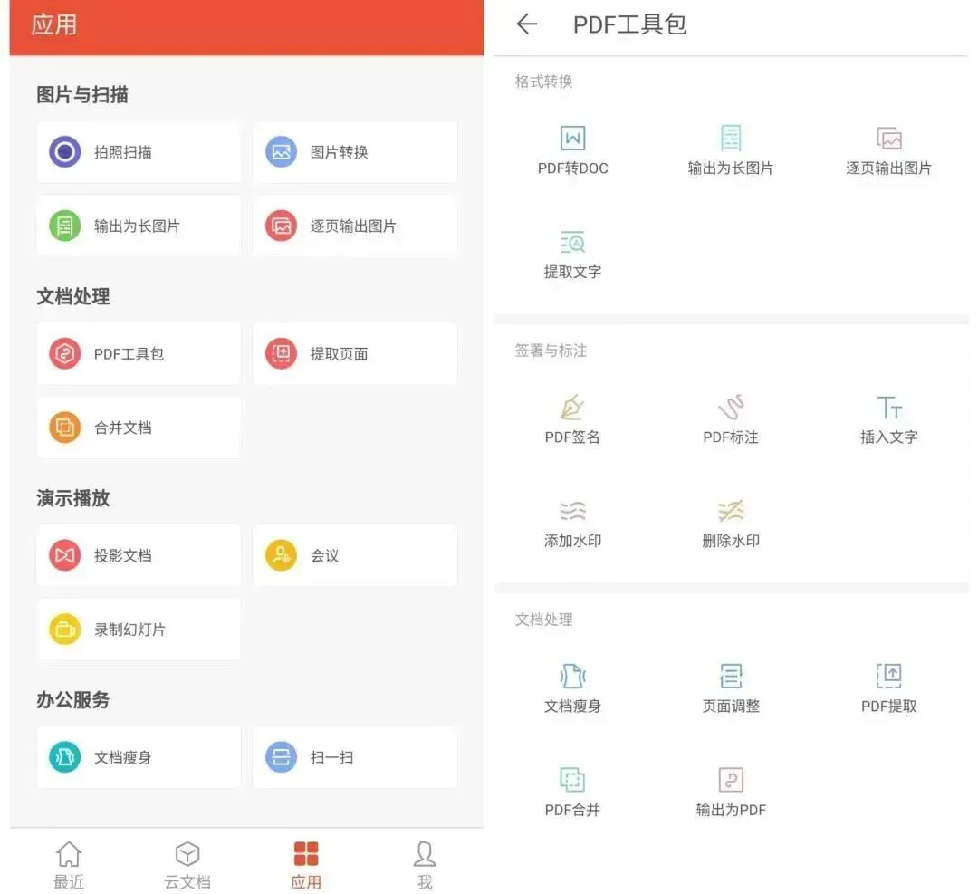虽然功能没有原版的那么多,但一些主要的办公工具还是有的,比如:拍照扫描文档、证件;图片格式转换、PDF工具箱、文档投影等。也支持登录,同步云文档