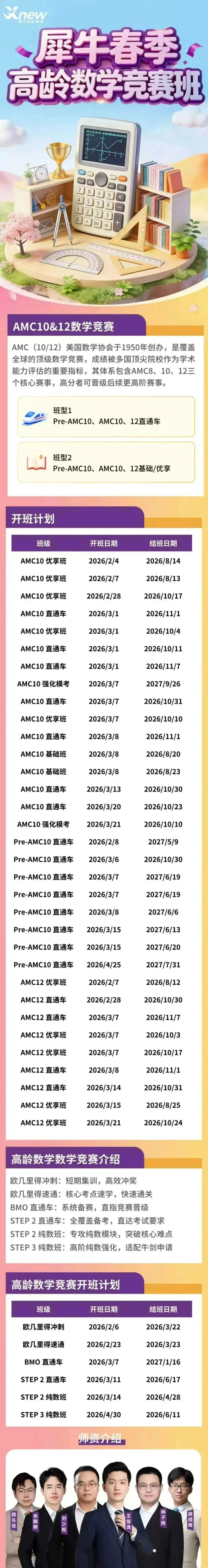 犀牛教育针对备考AMC10竞赛的同学们开设课程培训,包括AMC10基础班、AMC10强化班、AMC10冲刺班、AMC10直通车等不同班型,满足不同学员学习。