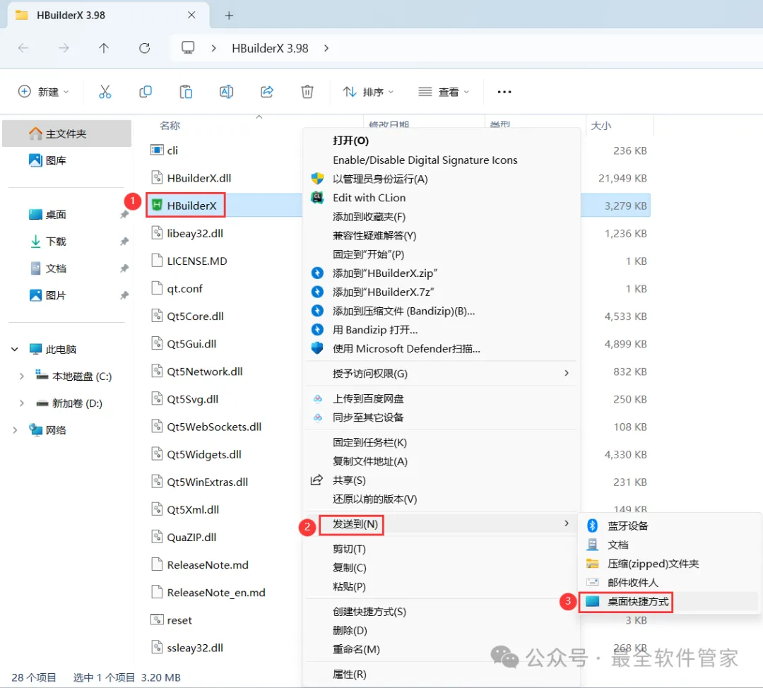 3、找到【HBuilderX】应用程序,右键依次点击【显示更多选项】、【发送到】、【桌面快捷方式创建】,完成HBuilderX 3.98软件桌面快捷方式的创建