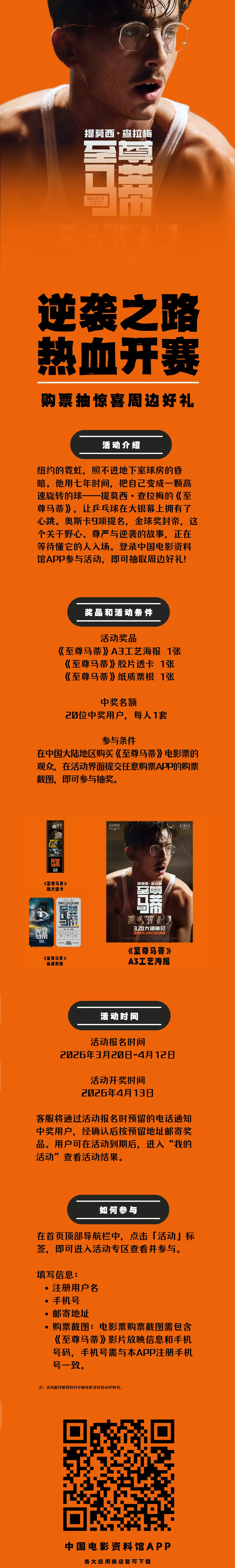 纽约的霓虹,照不进地下室球房的昏暗。他用七年时间,把自己变成一颗高速旋转的球——提莫西·查拉梅的《至尊马蒂》,让乒乓球在大银幕上拥有了心跳。奥斯卡9项提名,金球奖封帝,这个关于野心,尊严与逆袭的故事,正在等待懂它的人入场。登录中国电影资料馆APP参与活动,即可抽取周边好礼!