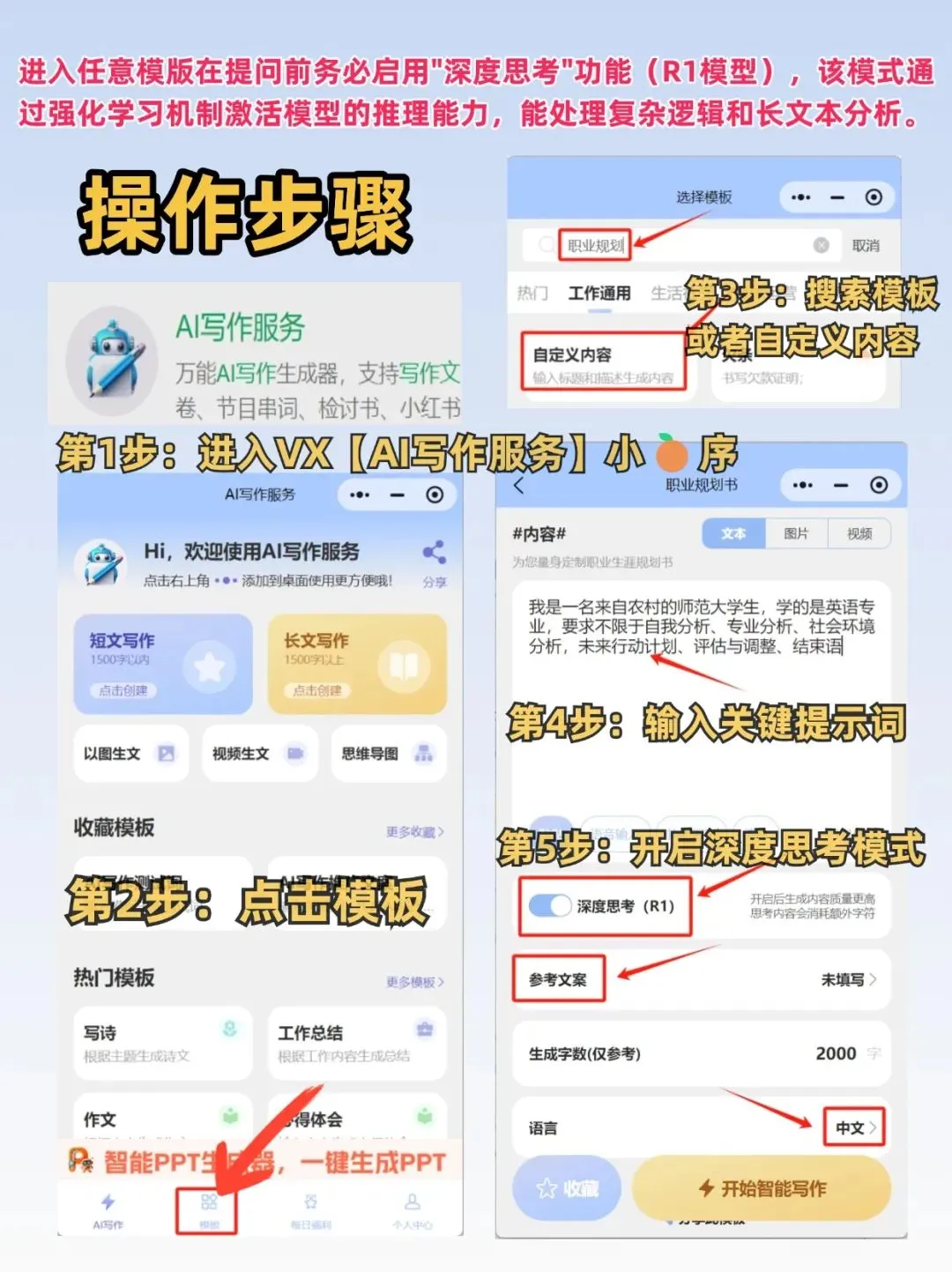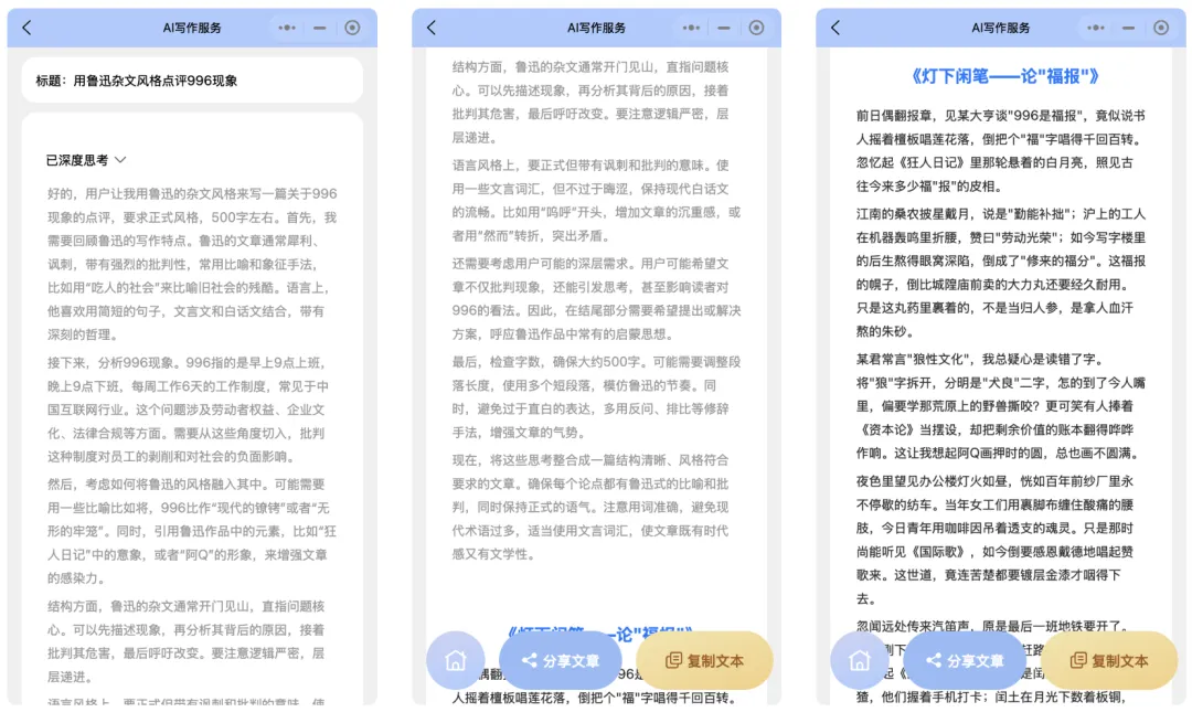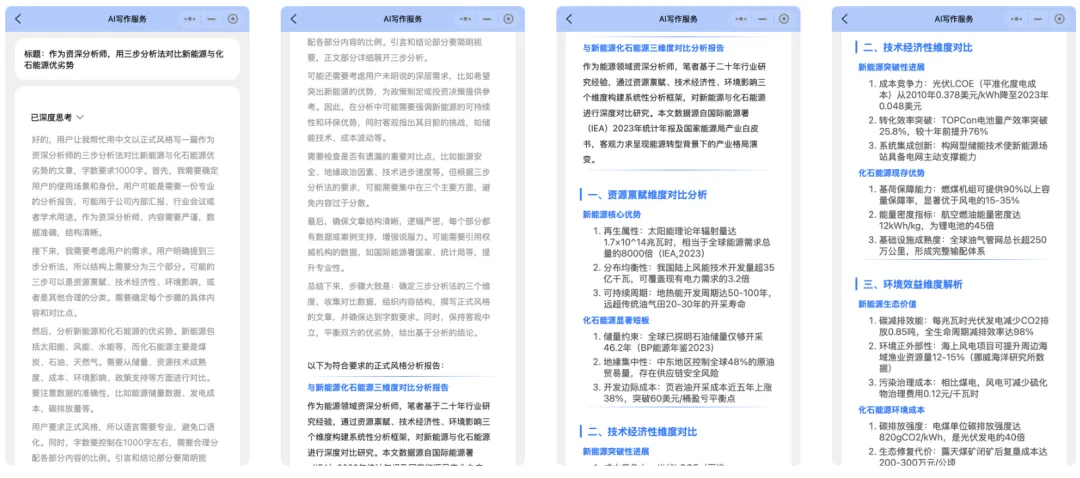而这个【AI写作服务】小程序已绑定DeepSeekR1 深度思考满血版,它能将DeepSeek与上千个AI写作神器相结合,在DeepSeek的基础上写出更加专业的文案。让小白也能轻松操作。
