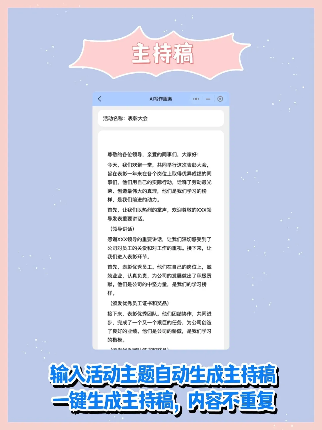 【主持稿生成器】输入需要主持的活动名称,自动生成主持稿!