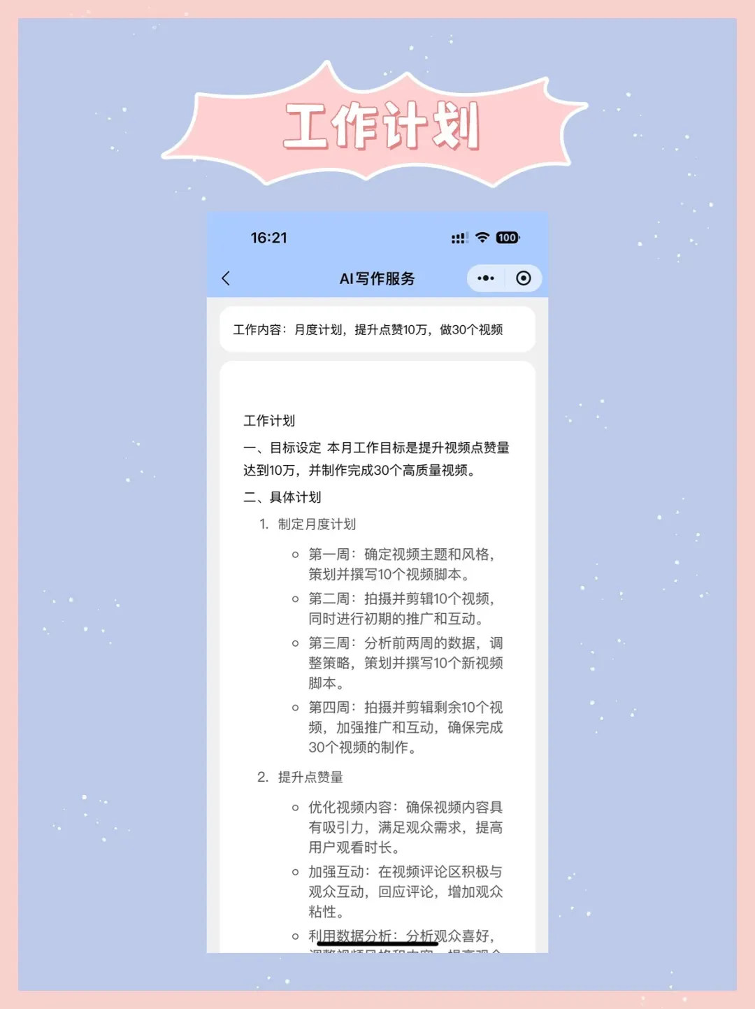 【工作计划生成器】输入工作目标,自动生成工作详细计划内容