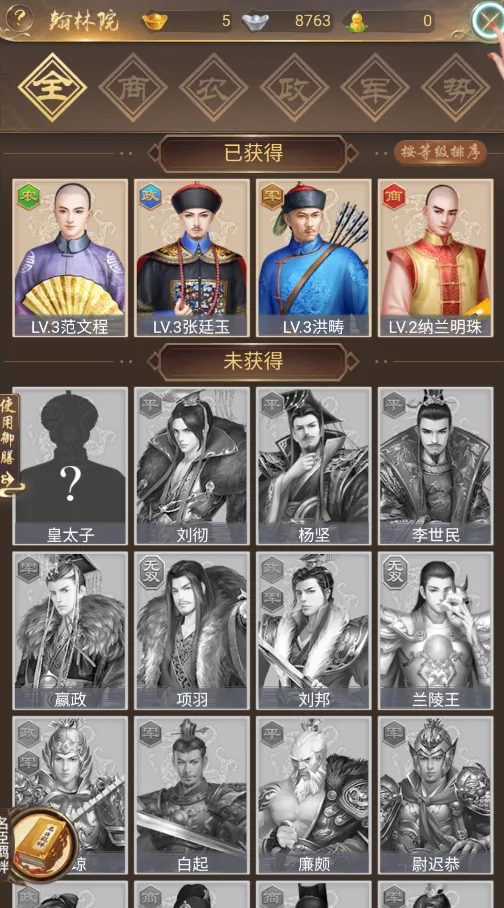特别是商业类的,前期银两获取主要是靠收税,商业大臣的加成也是很小很小的,平均培养只会把资源分散了,拖慢冲级的速度。
