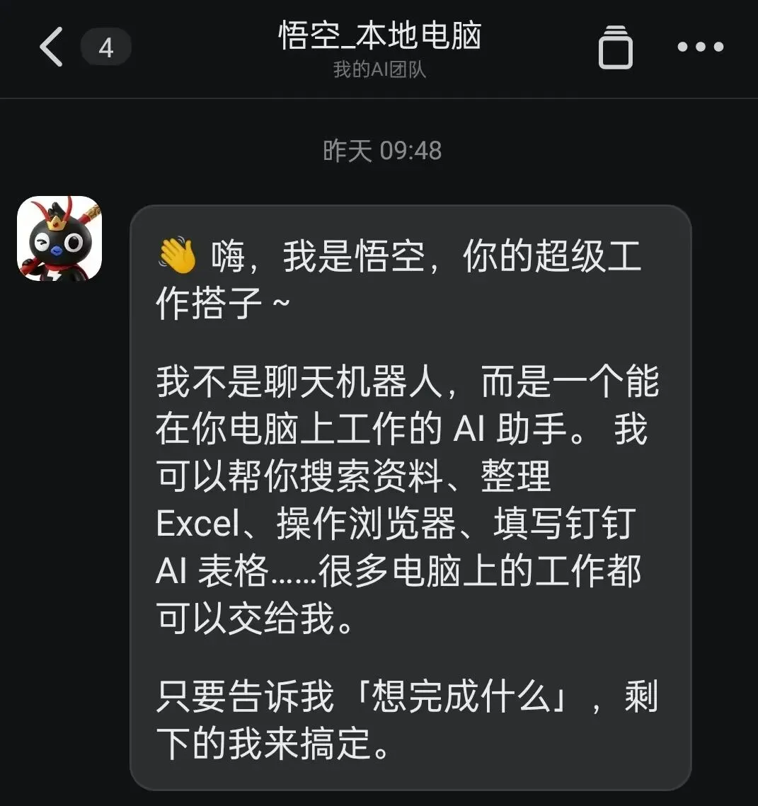 首先是安装,非常简单丝滑,到官网:https://www.dingtalk.com/wukong?from=guanwang 下载安装包直接装就行,。桌面版安装完之后,手机钉钉就自动有了一个机器人,可以指挥电脑办公。本次,我主要用的桌面版体验