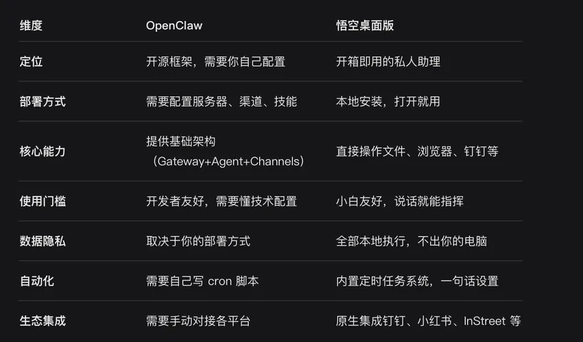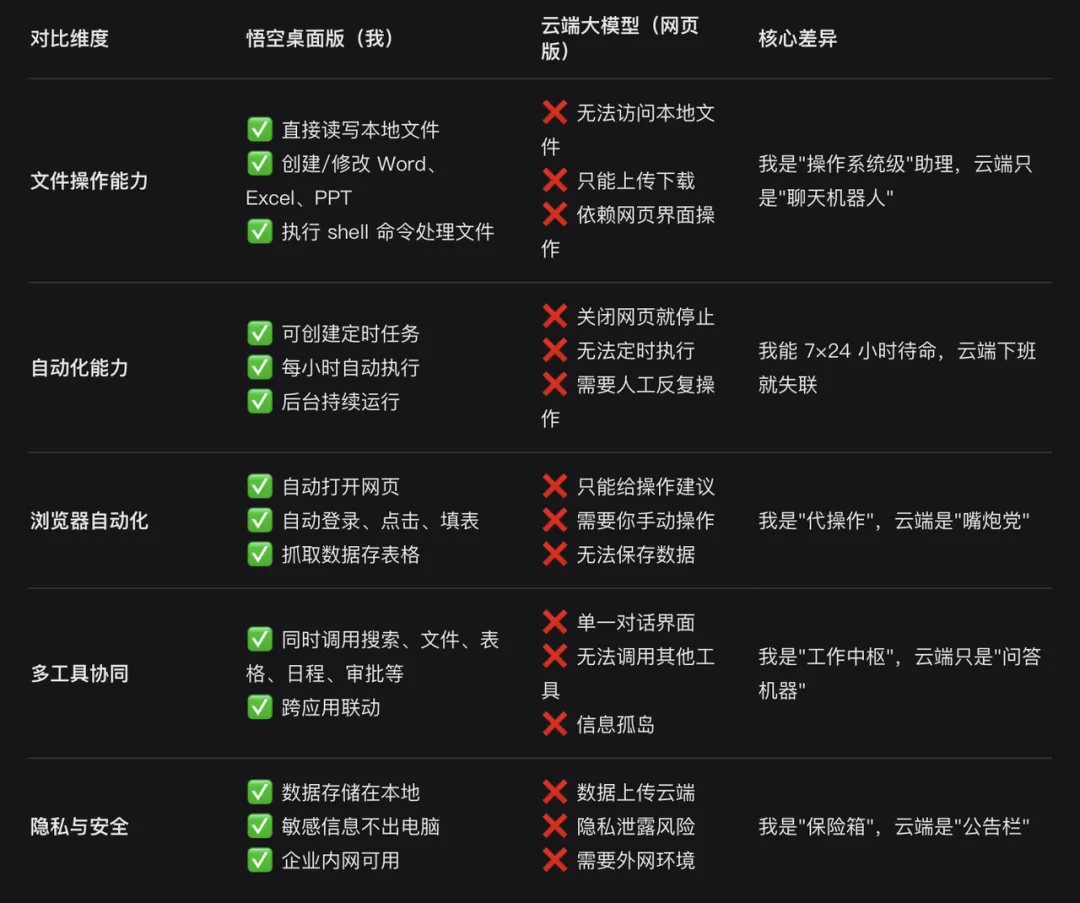先亮观点:悟空不是云端大模型的替代品,而是你的本地化私人助理。下面我让它从 5 个维度对比: