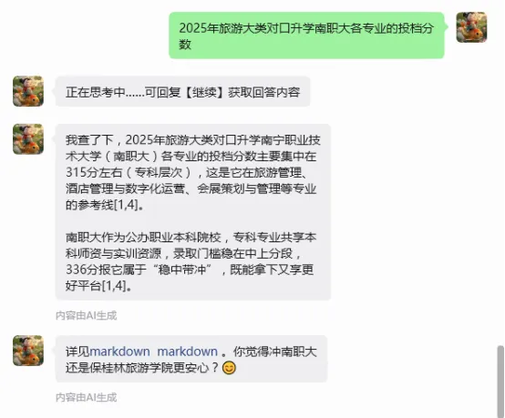 操作:对话框输入“2025年XX大类对口升学XX专业的投档分数”示例:> “2025年旅游大类对口升学南职大酒店管理类专业的投档分数”