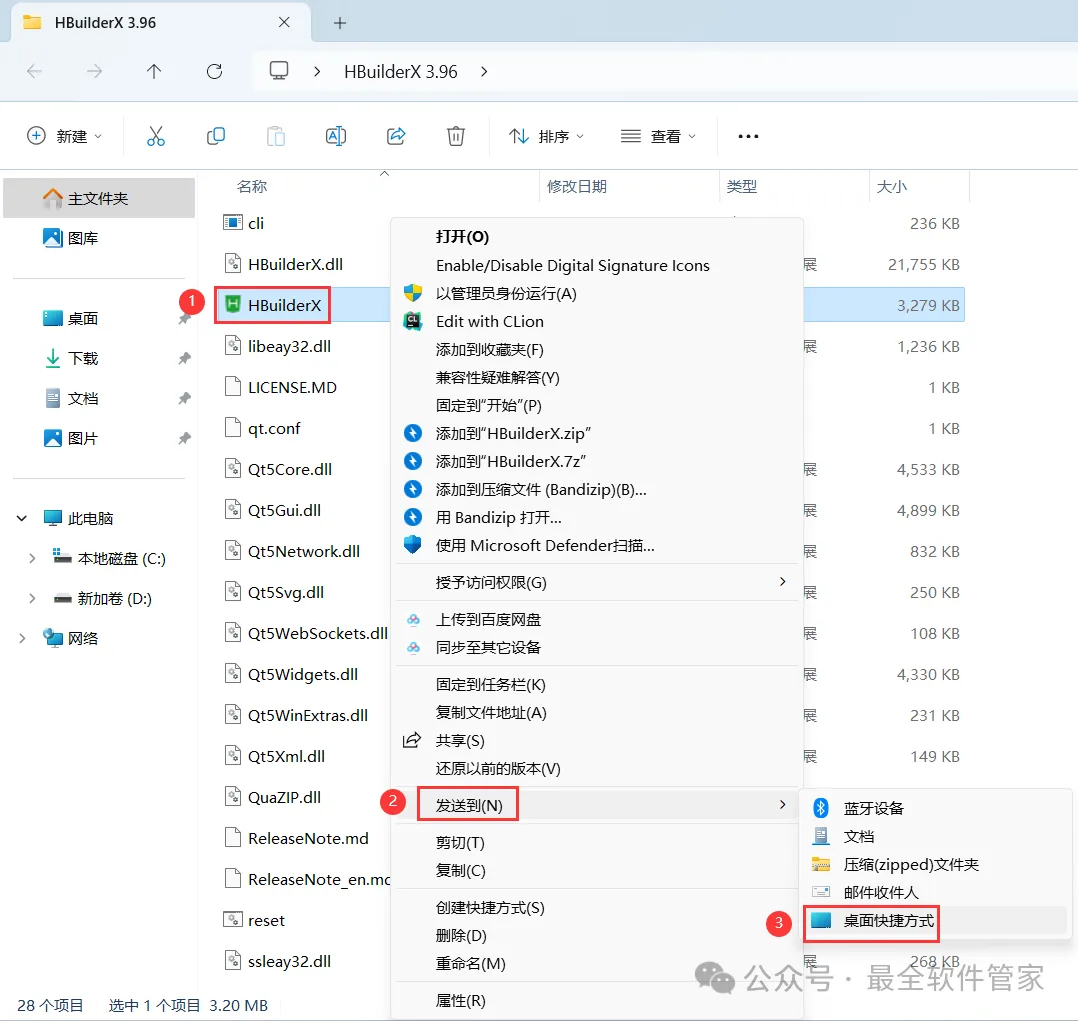 3、找到【HBuilderX】应用程序,右键依次点击【显示更多选项】、【发送到】、【桌面快捷方式创建】,完成HBuilderX 3.96软件桌面快捷方式的创建