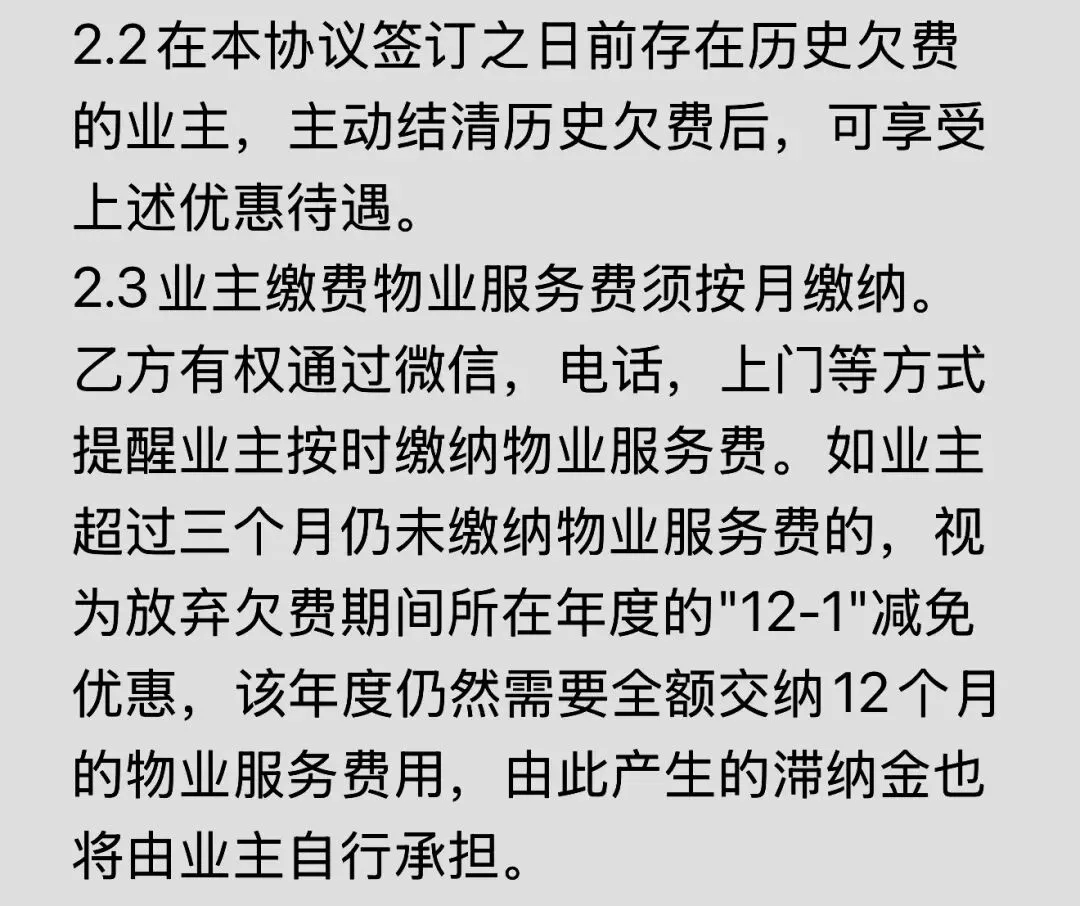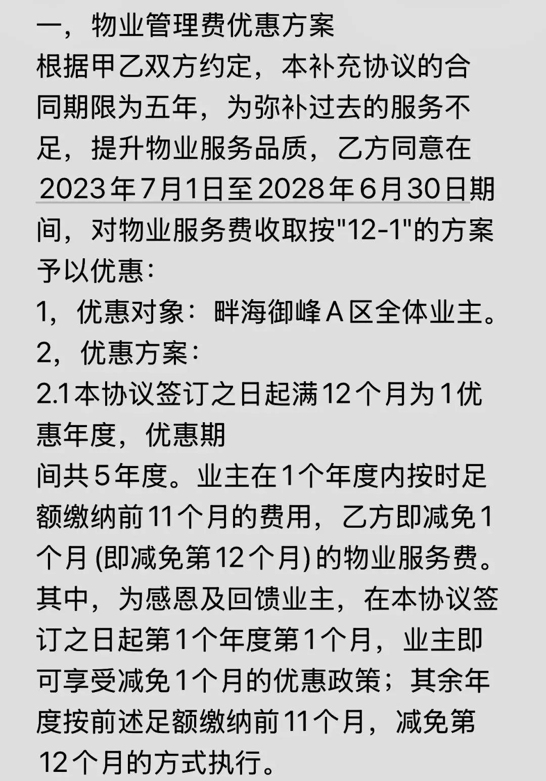 2023年,由业主大会决议授权,同年7月1日与服务单位签定新服务合约及补充协议之日起,我区23、24年两个年度依约享受物业服务费减免优惠的,分别已在2023年7月与2025年7月兑现。