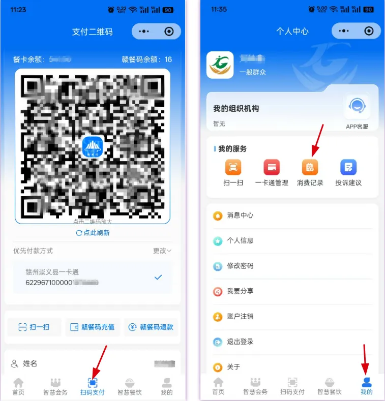 1. 赣餐码:干部职工可通过点击“扫码支付”出示赣餐码二维码实现无卡支付,还可查询交易记录。