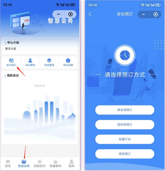 2. 智慧会务:单位智慧会议预订人可通过点击“会议预订”查看相关会议室介绍及占用状态,进行会议预约。