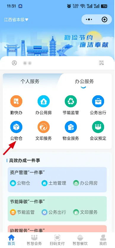 5. 公物仓:点击后进入公物仓管理平台,可查看在仓资产并办理出入仓申请;也可通过电脑端登录智慧江西机关事务管理平台官网,进行公物仓资产查询及出入仓申请等操作。