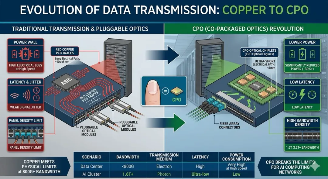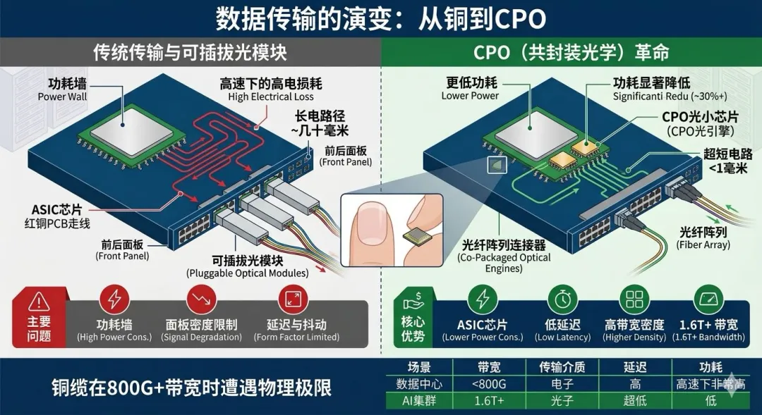 CPO的出现,本质上是一场传输介质的革命:让光的触角,直接延伸到核心芯片的旁边,取代大部分铜线。