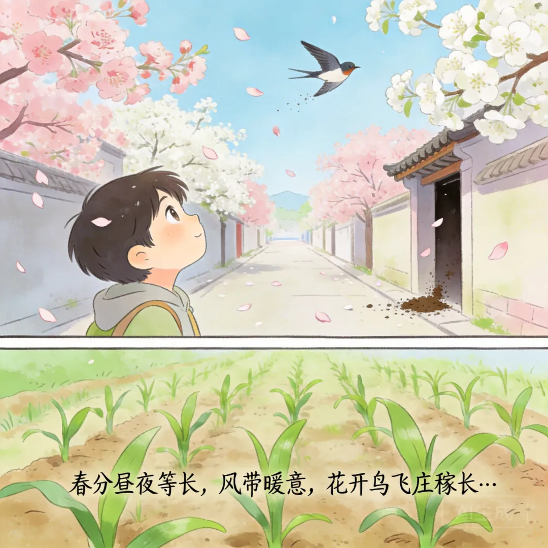 春分昼夜等长,暖意融融,万物生长,百花盛开,燕子穿梭。春分有吃春菜、放风筝、竖蛋等习俗,寓意平安顺遂。