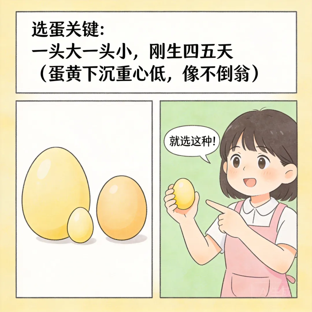 选蛋很关键,要选一头大一头小、刚生四五天的蛋,蛋黄下沉重心低。