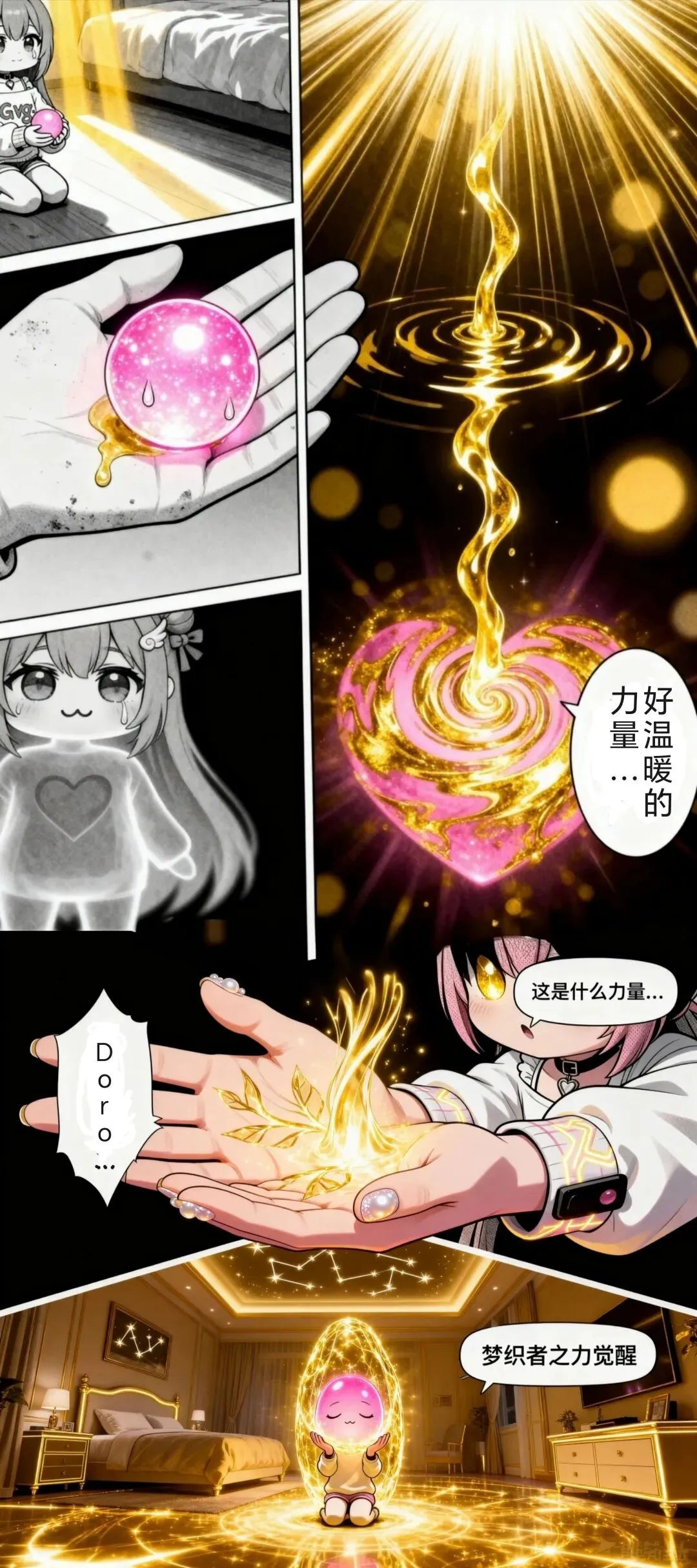 “……梦织者可以进入别人的梦境。但你还没学会。很危险。”Doro看着自己胸口的金色,声音有些哽咽。