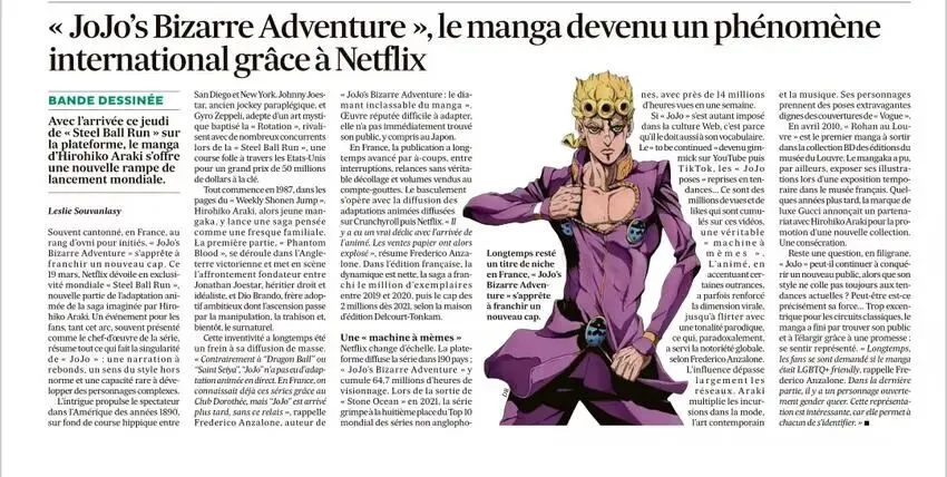 « Contrairement à “Dragon Ball” ou “Saint Seiya”, JoJo n’a pas eu d’adaptation animée en direct. En France, on connaissait déjà ces séries grâce au Club Dorothée, mais “JoJo” est arrivé plus tard, sans ce relais », rappelle Frederico Anzalone, auteur de « JoJo’s Bizarre Adventure : le diamant inclassable du manga ».