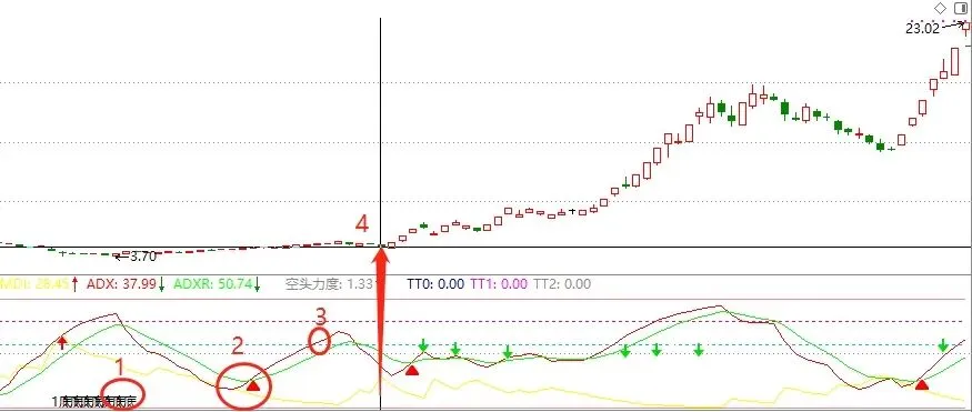 MTR:=EXPMEMA(MAX(MAX(HIGH-LOW,ABS(HIGH-REF(CLOSE,1))),ABS(REF(CLOSE,1)-LOW)),14);HD:=HIGH-REF(HIGH,1);LD:=REF(LOW,1)-LOW;DMP:=EXPMEMA(IF(HD>0&&HD>LD,HD,0),14);DMM:=EXPMEMA(IF(LD>0&&LD>HD,LD,0),14);PDI:=DMP*100/MTR;MDI:=DMM*100/MTR;ADX:=EXPMEMA(ABS(MDI-PDI)/(MDI+PDI)*100,6);ADXR:=EXPMEMA(ADX,6);空头力度:=MDI/PDI;N3:=BARSLAST(CROSS(空头力度,5));N4:=BARSLAST(CROSS(PDI,MDI));N5:=COUNT(CROSS(空头力度,5),N4);T1:=N5=1 AND 空头力度>5;N6:=BARSLAST(T1);N7:=BARSLAST(CROSS(PDI,MDI));N8:=BARSLAST(CROSS(ADX,58));HH:=HHV(H,N6);LL:=LLV(L,N6);X1:=LL+0.618*(HH-LL);X2:=LL+0.382*(HH-LL);TT1:=N6>N7 AND N7>N8 AND CROSS(X1,C) AND COUNT(CROSS(ADX,ADXR),N6)=1;TT2:=N6>N7 AND N7>N8 AND CROSS(X2,C) AND COUNT(CROSS(ADX,ADXR),N6)=1;TT1 OR TT2;