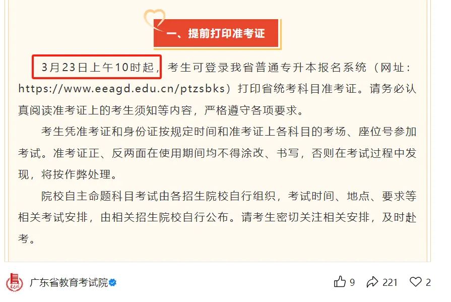 刚刚,广东省教育考试院发布最新通知:3月23日上午10时起开放普通专升本考试准考证打印。
