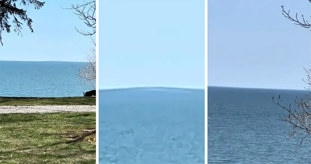 第一张照片是日食前拍的,伊利湖上出现了一个巨大的凸起。第二张照片是放大后的画面。第三张照片是日食后拍的,凸起消失了。当时有数百人围观,大家都在好奇地看着这个凸起,想知道它是什么。