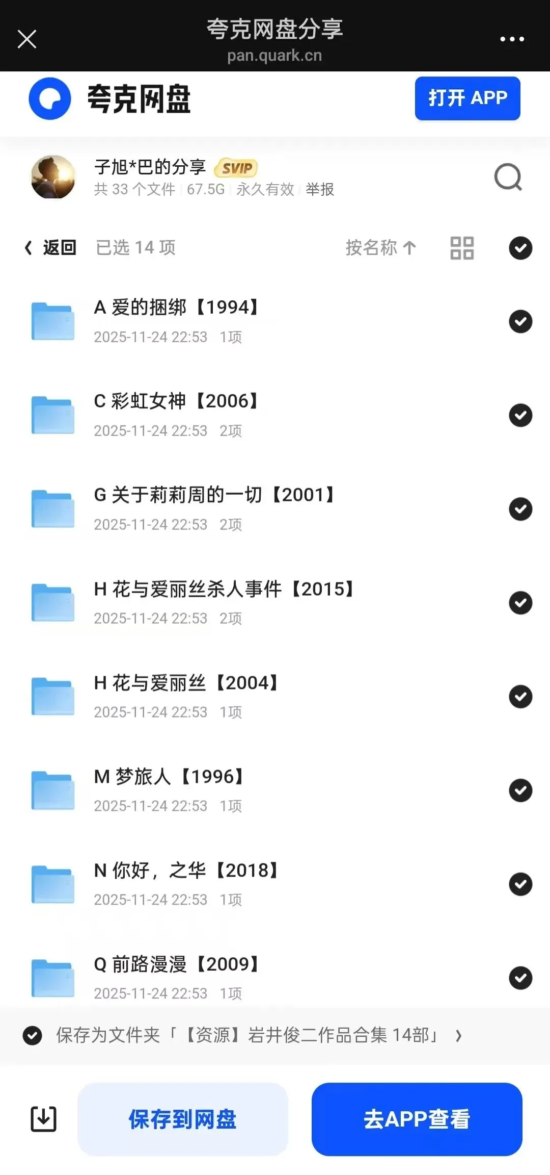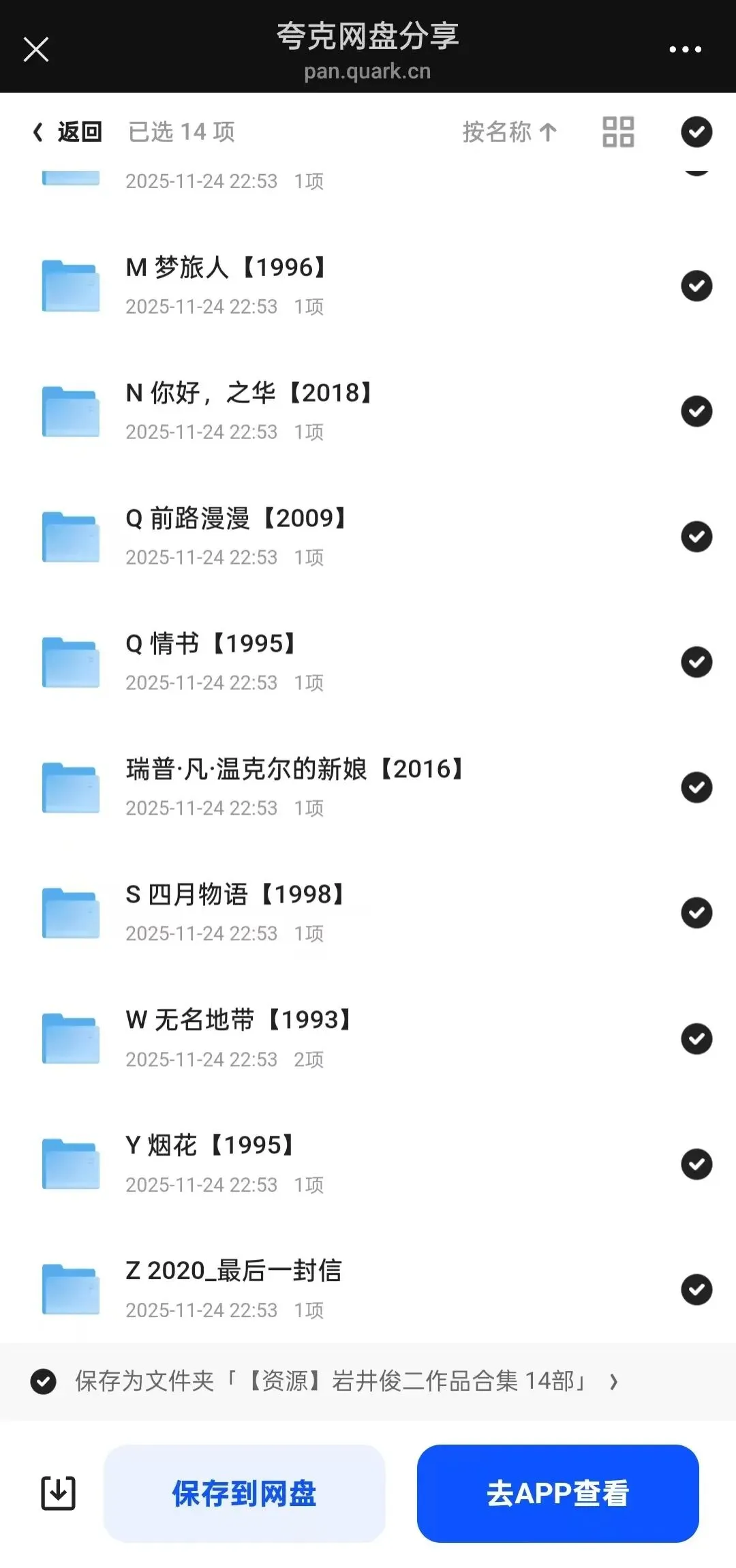 【资源】岩井俊二作品合集 14部 点击蓝字,关注我们 💌 99%的人都错过的青春密码!岩井俊二14部神作全收录✨ 从《情书》到《燕尾蝶》,每一帧都是心动暴击💥 文艺青年必看的治愈清单来啦!👇#岩井俊二 #文艺青年 #电影清单 END 点分享 点收藏 点在看 点点赞