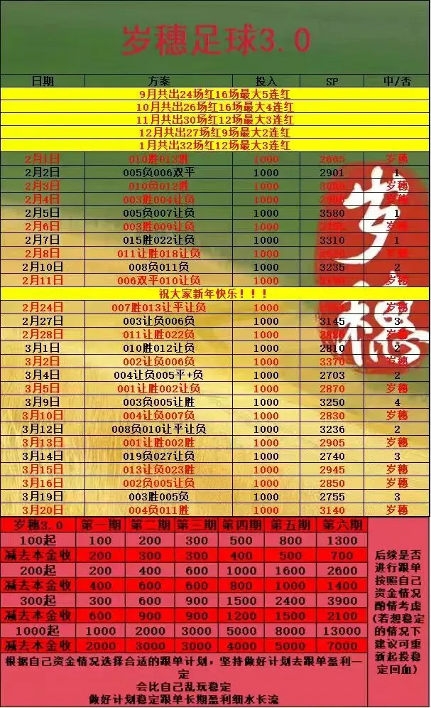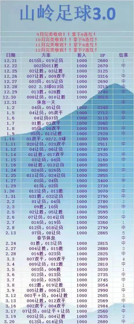 3.20优质3.0合集 更多红单获取: 免责声明 文章中提供的相关赛事解读、信息及数据皆来自官方网站,仅可作为参考之用,并不构成任何决定性建议,广大彩民请务必独立思考,自行做出明确决策。请大家遵守国家法律法规,通过合法途径购买中国体育彩票
