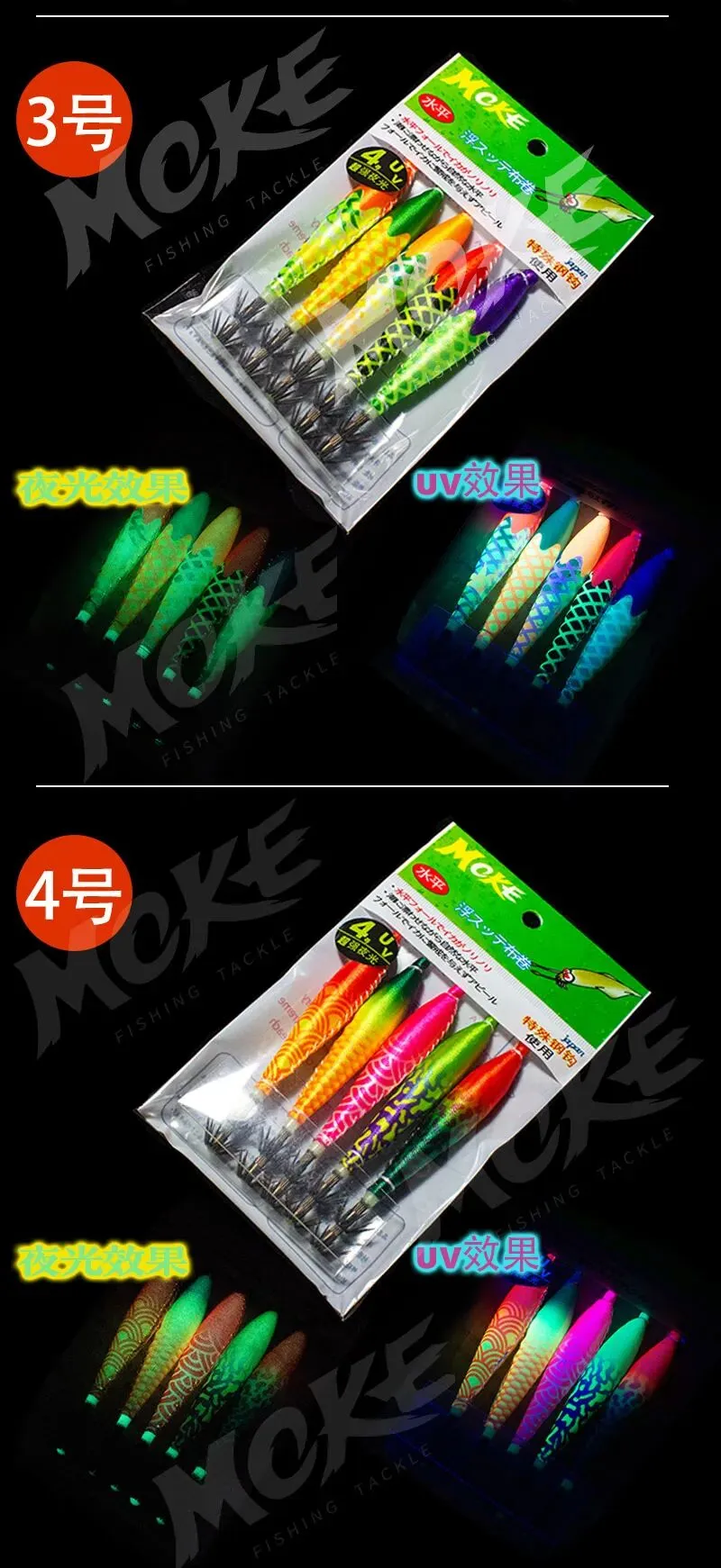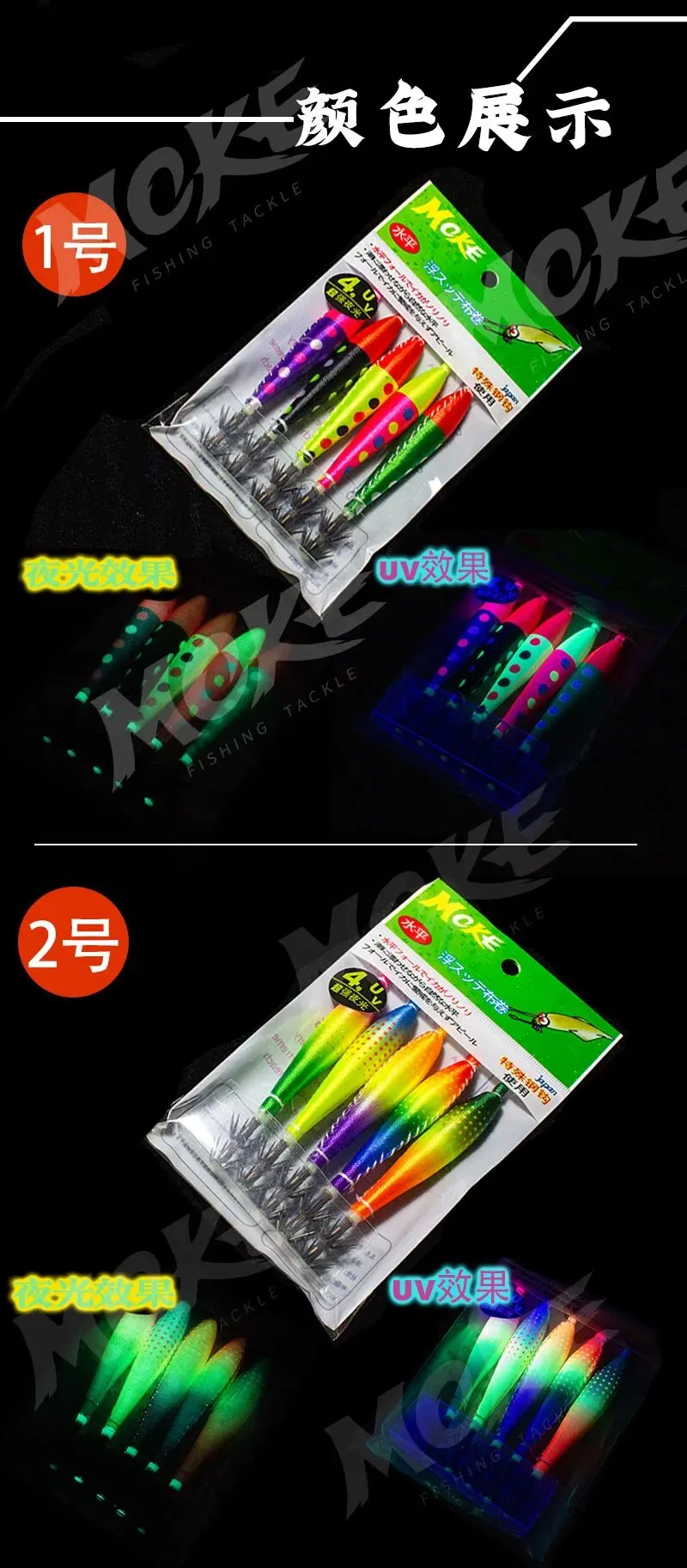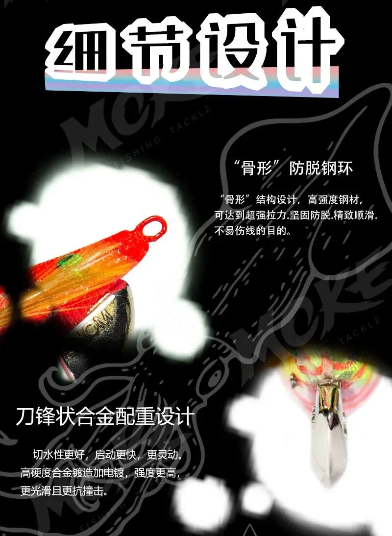 主体自带夜光效果,极适合夜间钓鱼,即使在水体光线较差的环境中,也能有效吸引鱿鱼注意。采用色彩艳丽的UV 涂料,色彩饱和度极高,在光线不足的环境下仍能吸引鱼群;阳光下呈现莹光效果,夜间在 UV 灯照射下会展现绚丽萤光,对鱿鱼有极高诱惑力。