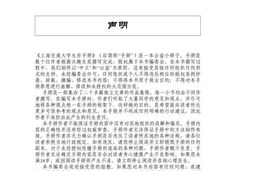 简介:这是一本由上海交通大学学生自发编写、流传于校内的非官方“民间指南”。其内容通常超越了常规的校园介绍,聚焦于在读学生视角下的选课策略、学业规划、资源获取、生活技巧乃至对校园文化、制度的个性化解读与“生存”建议,风格务实且带有学生群体特有的诙谐与自嘲色彩,旨在为新生及在校生提供一套来自学长学姐的、高度实用的“过来人”经验与内部参考。