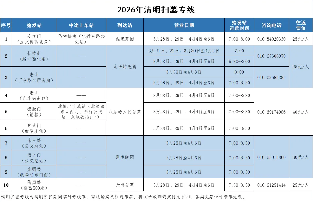 为方便市民清明祭扫出行,北京公交集团将于2026年3月21日至4月6日的祭扫高峰日开通由市区往返温泉墓园、太子峪陵园、八达岭人民公墓、通惠陵园和天慈公墓等5处陵园墓地的10条清明扫墓专线。