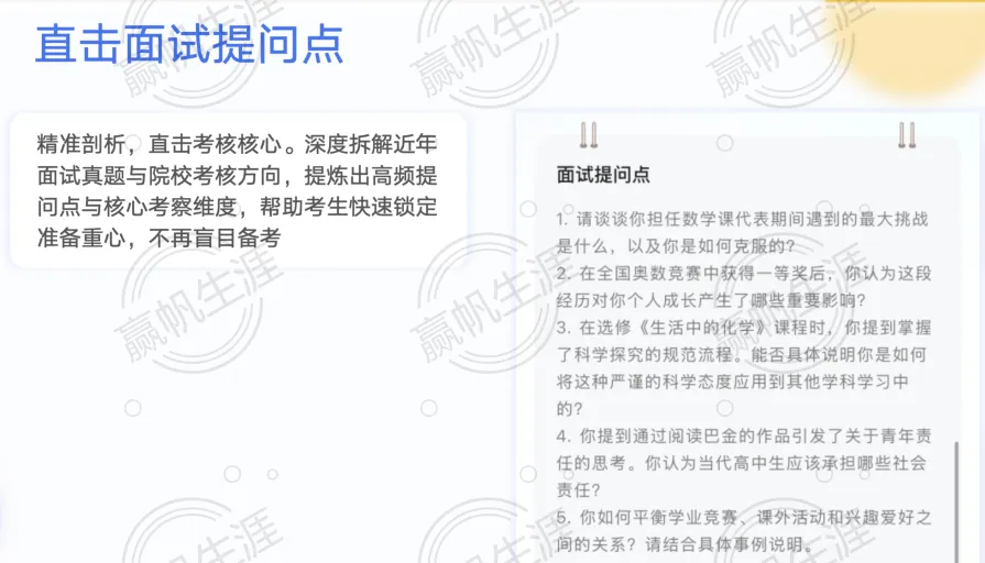 综评文书的价值远不止于提交一刻。基于对历年综评高频提问点的深入分析与推理,“墨核伴学”能够在写作过程中同步生成可能的面试追问方向,将面试准备前置融入文书撰写。当其他工具还在关注文字本身时,我们已经帮助学生预判高校关注的深层问题,让每一段经历都能经得起面试官的层层追问。这种“文书即面试预演”的设计,使学生在提交文书之时,便已开始为最终的综评考核积累优势。