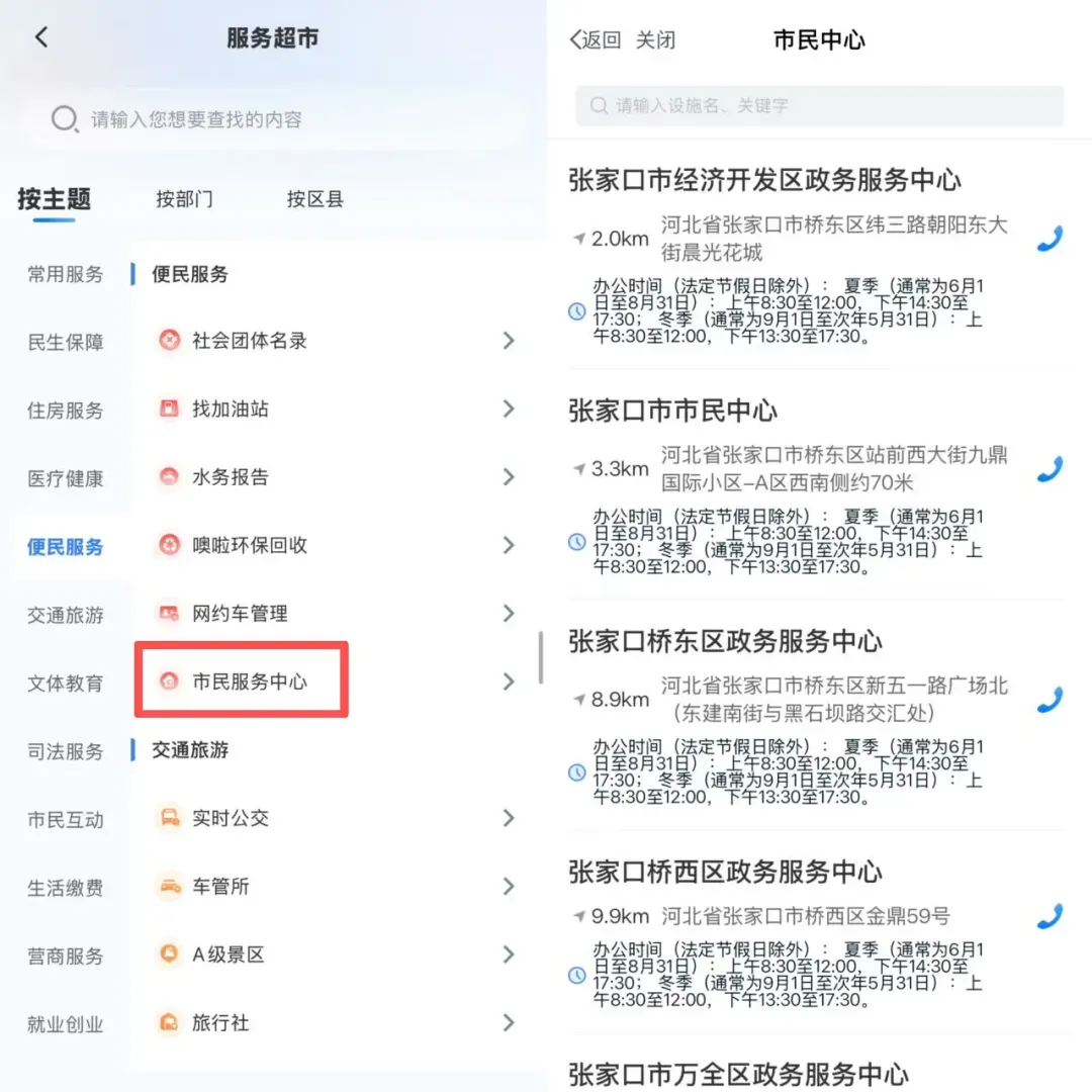 打开“幸福张家口”App,进入服务超市,选择【便民服务】栏目,点击“市民服务中心”服务,系统会自动定位你当前位置,并清晰展示周边所有市民服务中心:
