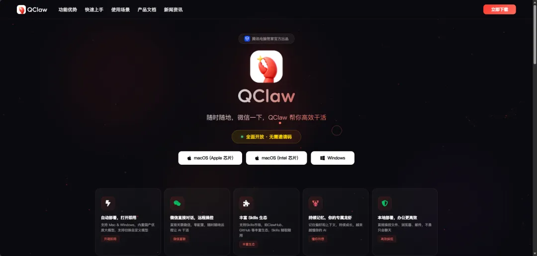 https://qclaw.qq.com/#features(安全无广告,直接选择系统版本下载)
