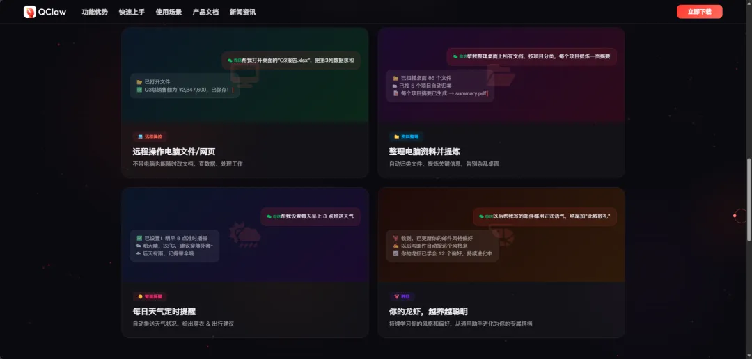 从日常办公到专业开发,从资料整理到学术研究,QClaw 的能力覆盖多场景,真正做到 “一句指令,搞定一切”,这些实用功能直接戳中办公痛点!