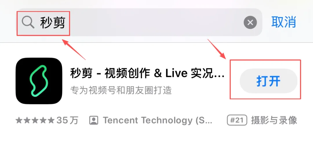 手机应用商店搜索关键词“秒剪”,即可点击下载