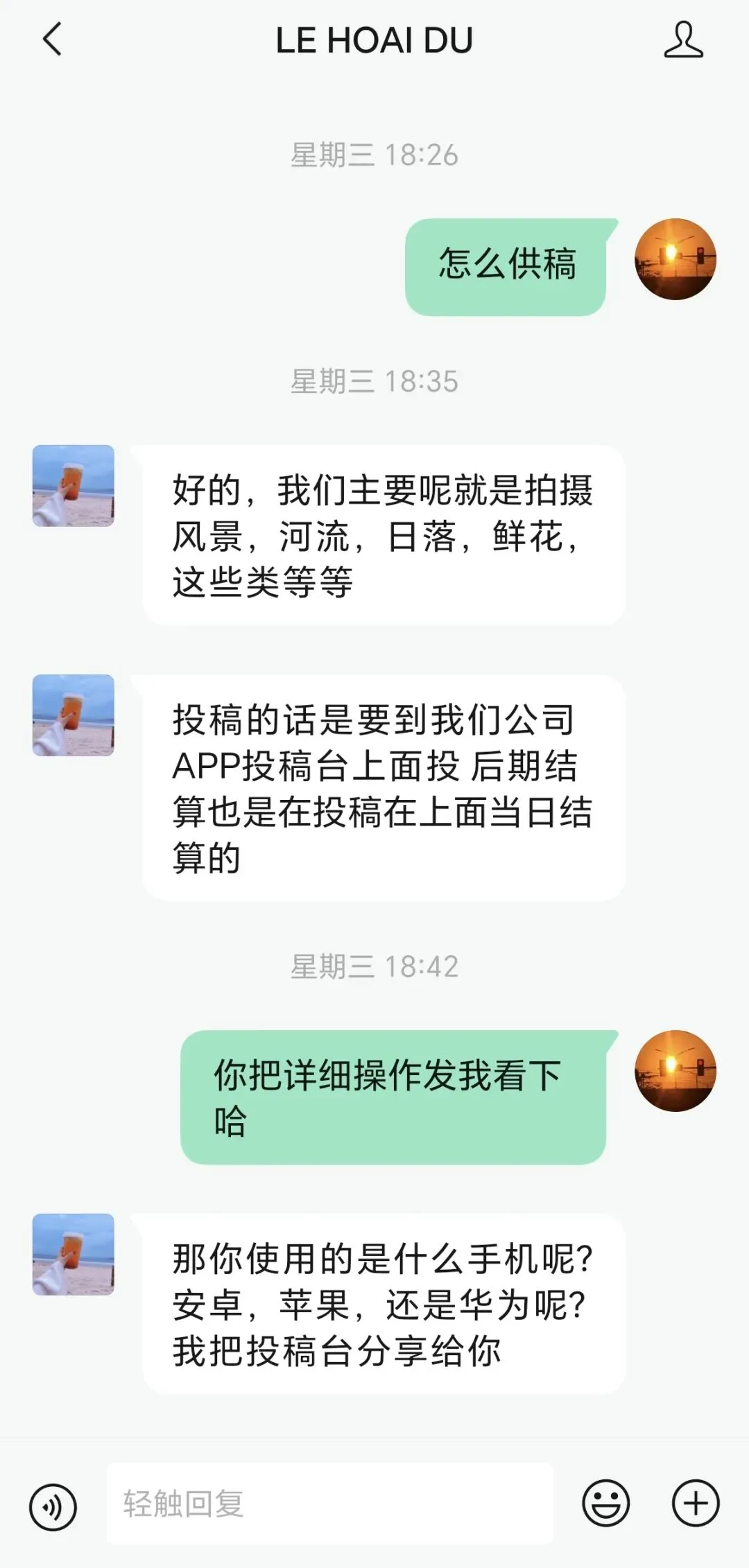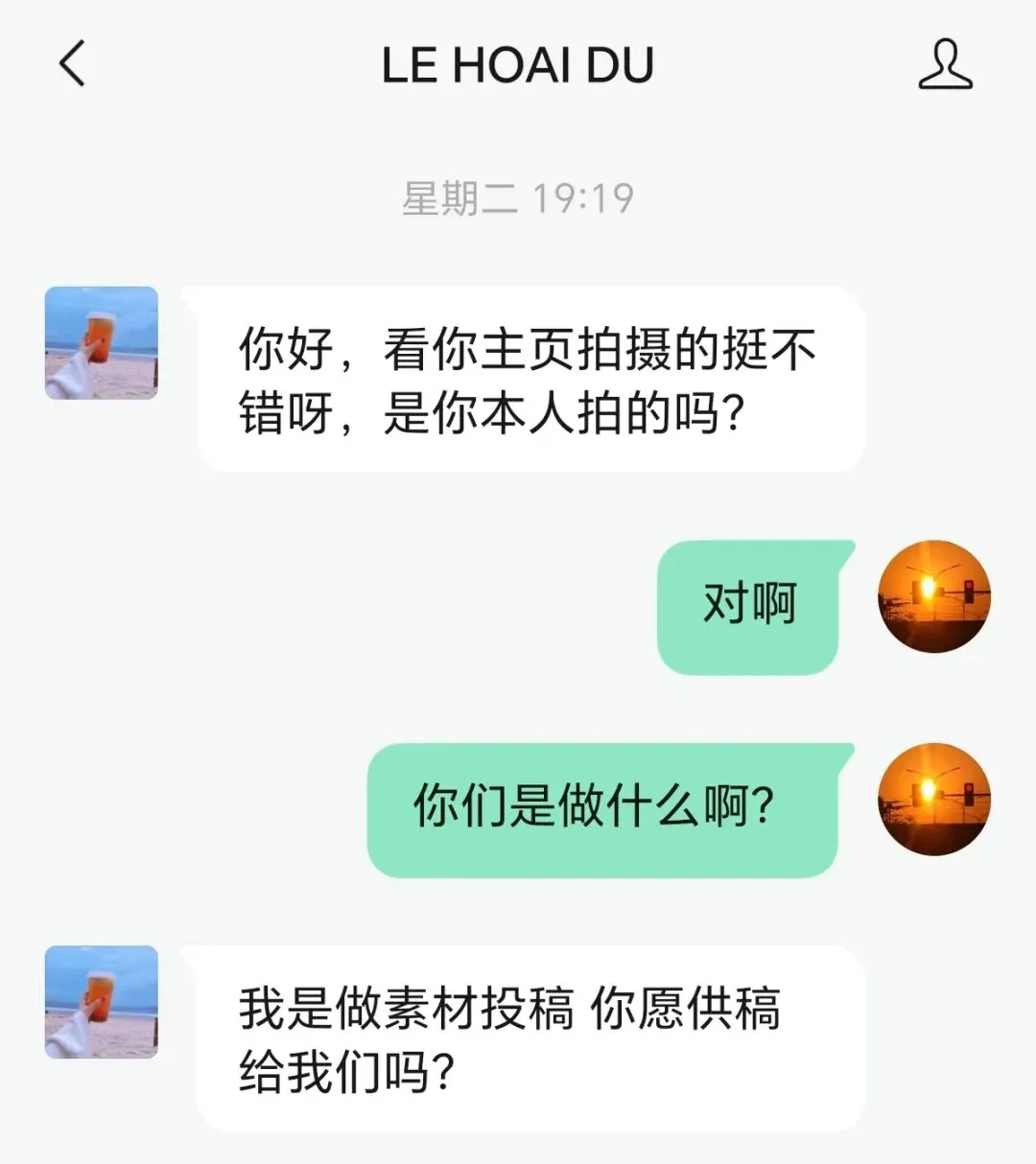 一开始当然是很开心的,也没啥戒心,觉得有人欣赏我这一般般的拍照技术,真的是走运了。能靠投稿赚点奶茶钱,那也很不错,甚至都想好了,以后休息时间一有空,就多去拍拍照片。不过很快,我这幻想就破灭了,因为这人的下一句话让我觉得不对劲了——