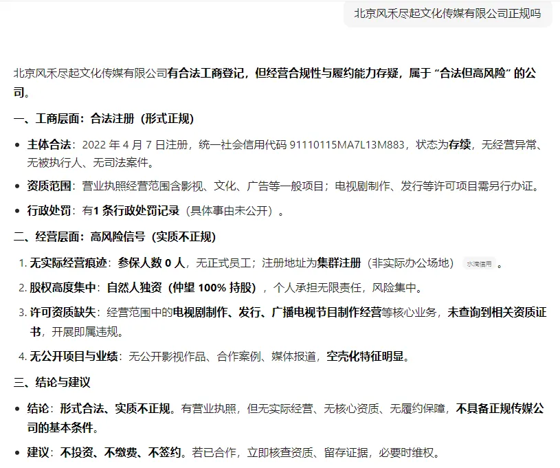 我当然没有再理这个人,后面把她拉黑了。在网上搜了一下,还真的不少人遇到了这个套路,而且如果你去询问对方是什么公司的话,看到不少网友反馈,这些人会自称是【北京风禾尽起文化传媒有限公司】的,估计是盗用公司名。我去豆包问了一下,得到的回复是: