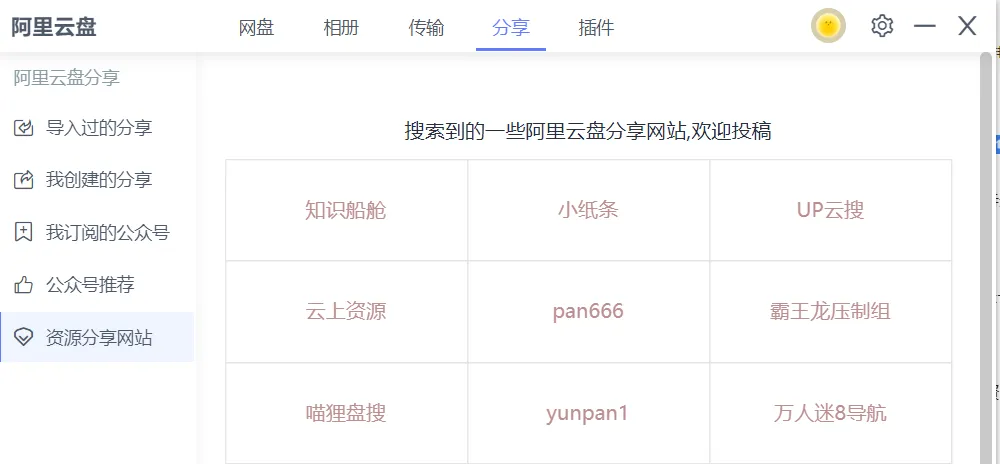 此外,云盘内置了一些云盘资源分享站点,如果你想找一些特定资源,可以在推荐的网站上进行搜索,更加快捷方便。