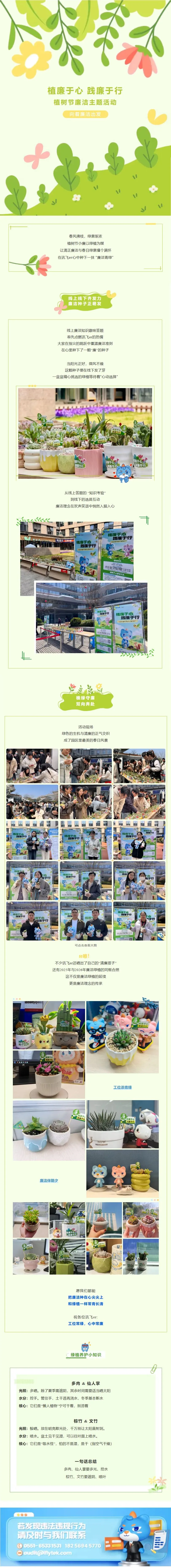 植树节期间,科大讯飞组织开展了一场别开生面的“春启新绿 廉润初心”廉洁主题活动,巧妙地将绿色生态与廉洁文化相结合。活动以“植廉于心 践廉于行”为主线,采取“线上+线下”联动模式。线上通过趣味知识答题,寓教于乐,普及廉洁准则。线下则设置选苗互动环节,员工亲手挑选绿植作为“清廉搭子”,让廉洁理念在欢声笑语中生根发芽。活动现场还特别呈现了2025年与2026年廉洁绿植的同框合照,象征廉洁理念的接续传承。活动旨在将廉洁意识像培育绿植一样深植员工心中,倡导“工位添青绿,廉洁伴朝夕”的日常浸润。结尾附上的绿植养护知识,更将“多光控水”、“遮阴喷叶”等要诀与廉洁自律的寓意巧妙关联,祝愿全体员工“工位常绿,心中常廉”。(来源:廉洁讯飞)