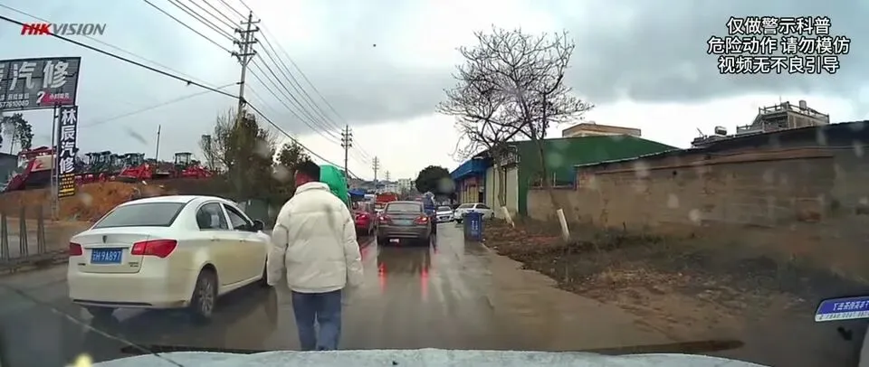 视频给到的画面是:“白色衣服男子下车阻挡后方车辆通行,为自己的车辆开道。”