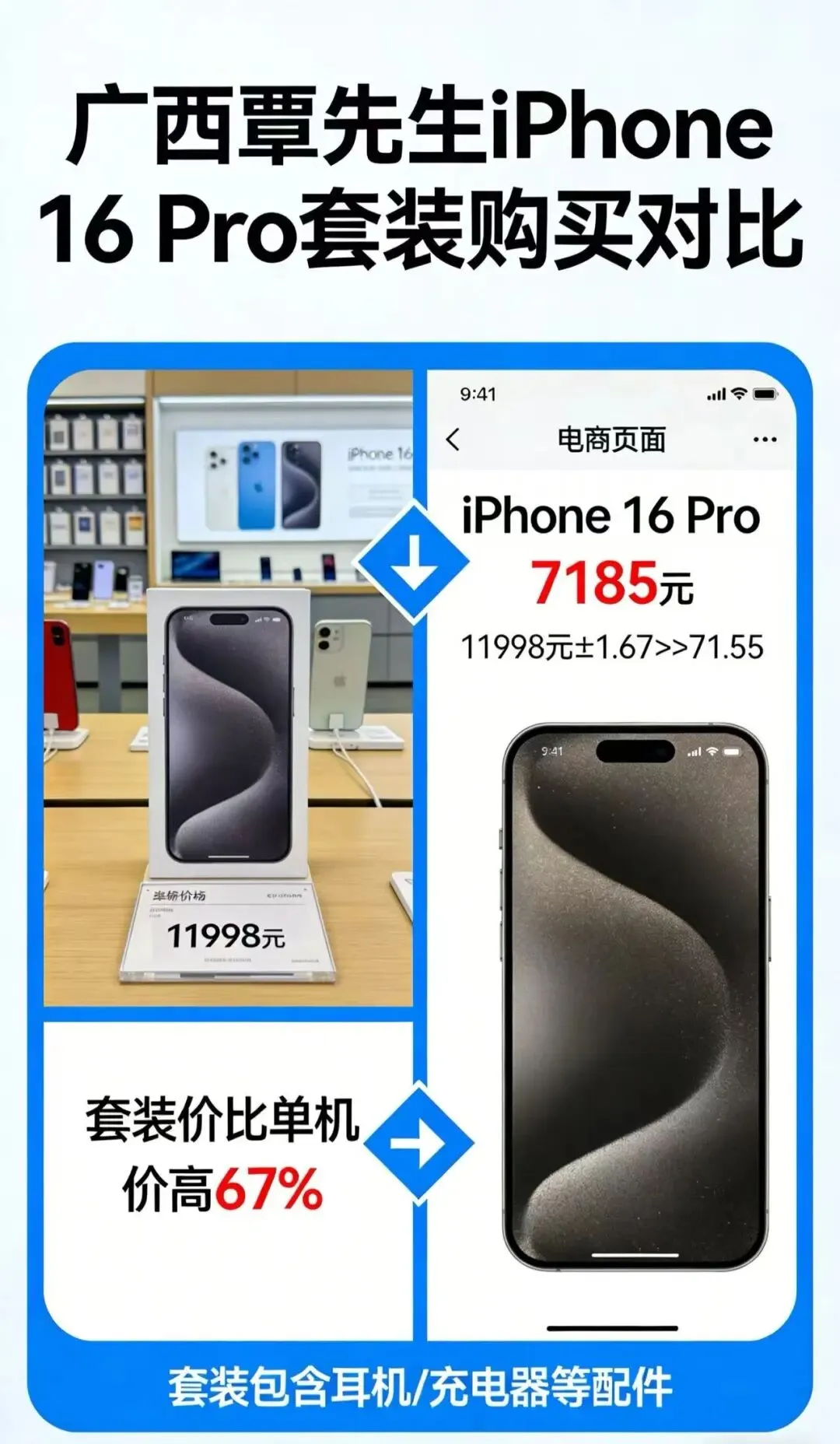 广西的覃先生在某平台购买iPhone 16 Pro套装,价格11998元,较主流电商平台单机价高出67%。