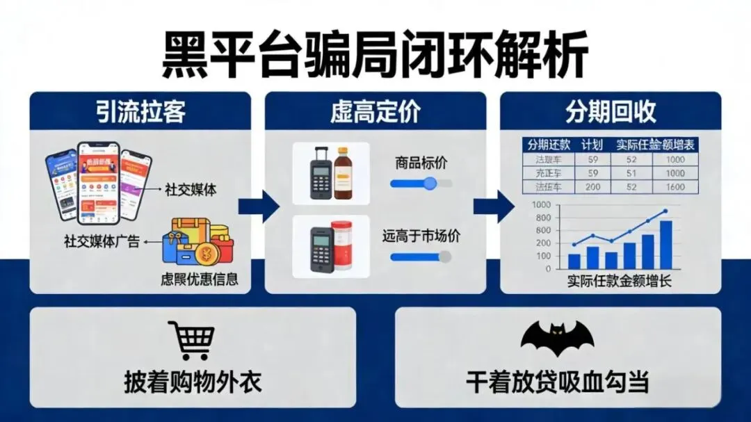 总结:黑平台从引流拉客、虚高定价到分期回收,形成完整骗局闭环,披着购物外衣,做着放贷吸血的勾当。