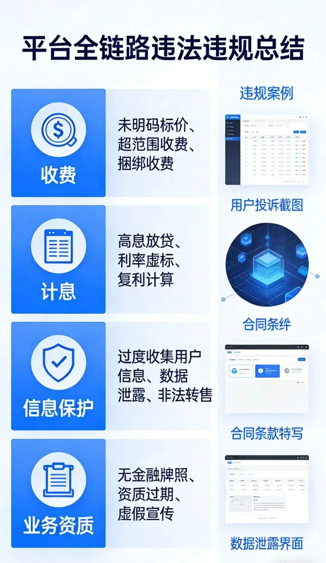 总结:从收费、计息到信息保护、业务资质,平台全链路违法违规,不是消费纠纷,而是实打实的违法操作。