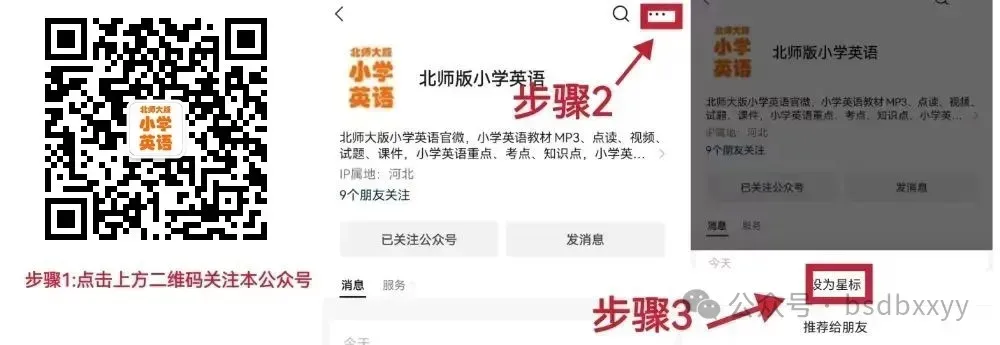 怎样获取打印版? 扫描下方二维码 进入“北师版小学英语”微信公众号 点击公众号首页左下方键盘图标 发送消息“2634” 即可获取打印版(不是在留言区哦)