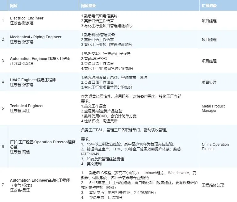 【外资:机械行业工厂 江苏职位合集】 01 在招岗位 2025 RECRUIT 02 简历投递 请微信扫码添加下方顾问企业微信, 将简历发送给顾问,发送时,请标注好“职能+岗位名称”。 收到您的简历后,我们会第一时间给您答复。 点击以下链接,海量职位等您搜寻: DB Talent 高端猎头