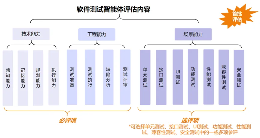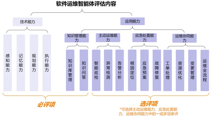 本评估依据《面向软件工程的智能体技术和应用要求 第2部分:运维智能体》标准,其中技术能力、知识管理能力为必评项,涵盖了智能体所需具备的基础技术要求;主动运维能力、应急处置能力、运维协同能力为选评选,企业可选择其中一项或多项参评。