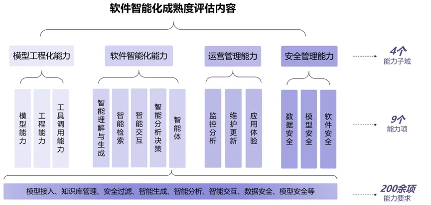 本评估以《软件智能化成熟度模型 通用能力要求》标准为依据,从模型工程化能力、软件智能化能力、运营管理能力、安全管理能力四大维度,规定了软件智能化成熟度模型的通用能力要求。