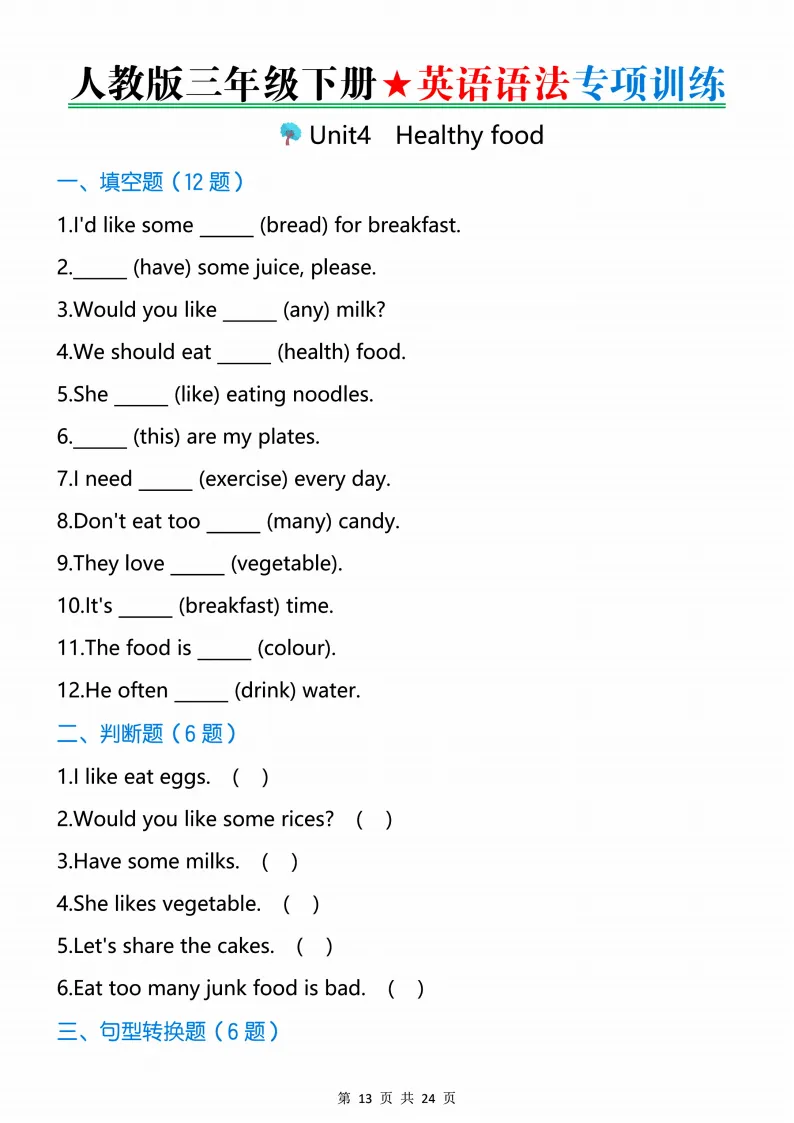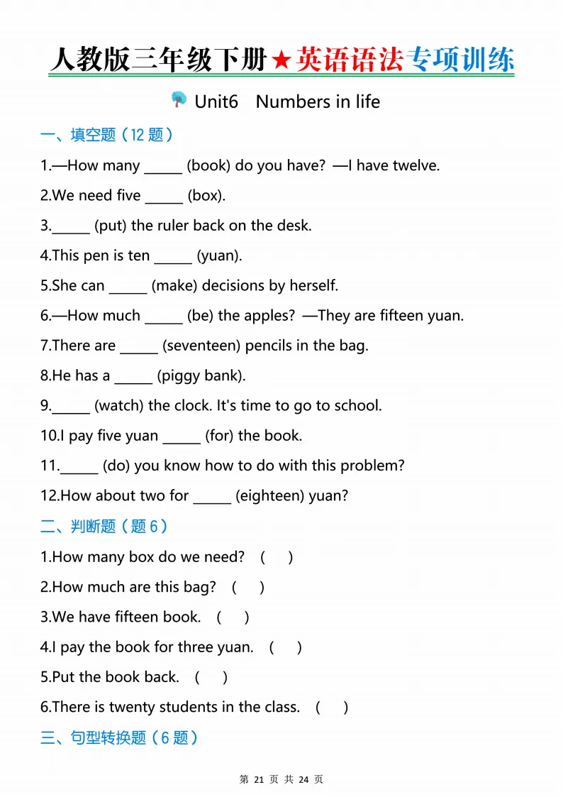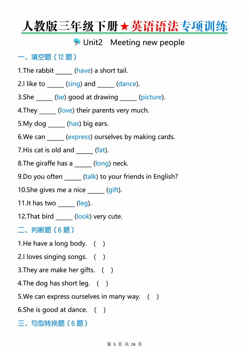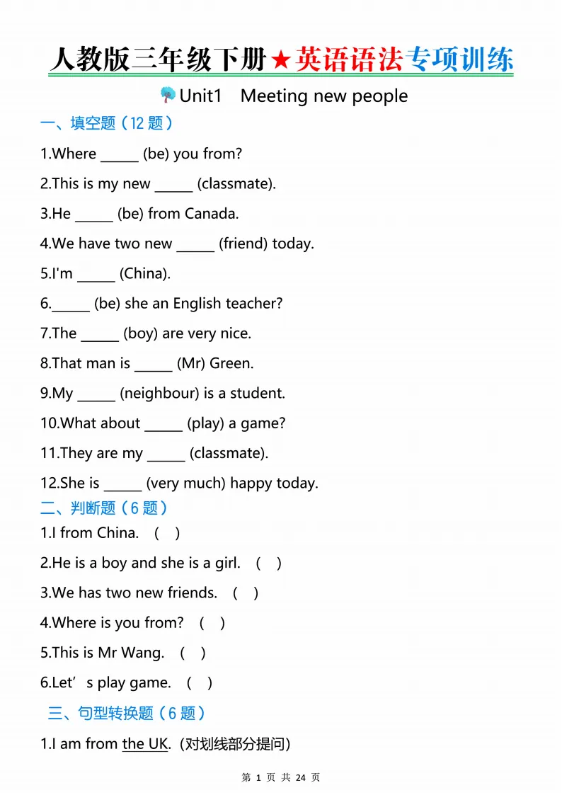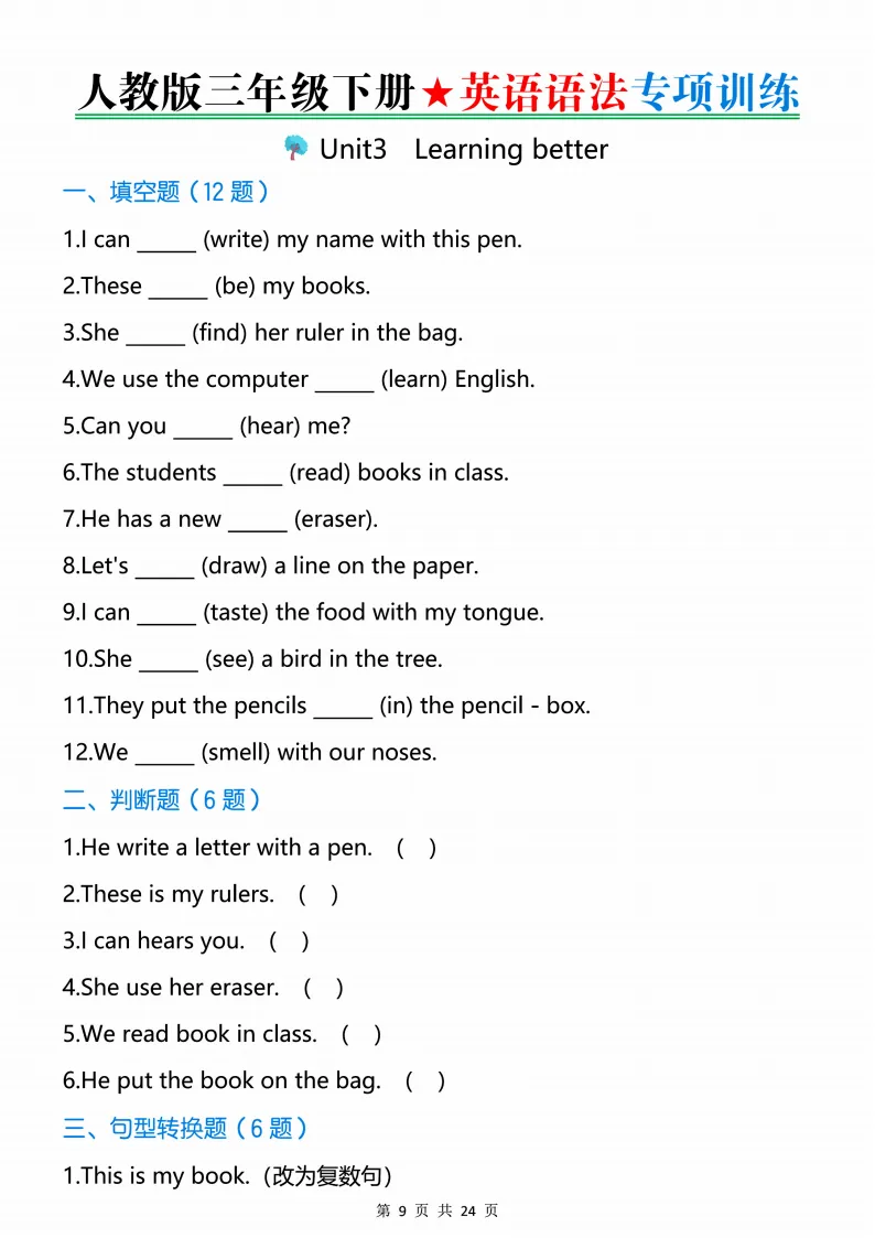 新版人教三下英语语法专项训练24页,电子版可打印 点击上方关注领取更多学习资源 新版人教三下英语语法专项训练24页,电子版可下载,同步教材每课内容。需要的家长抓紧打印出来,让孩子用起来。 (温馨提示:文末有完整电子版领取方式) 免费领取电版 关注公众号:“博学小课堂” 文章文末:点赞+再看 发送关键字:260320 说明 教辅在精不在多 ,如果觉得资料好,孩子需要正常使用 ,建议购买正版图书本公众号分享教辅资料,是为了给大家介绍、展示教辅资料的内容和特点,推荐大家购买正版教辅。 为了更好地展示资料的情况,我们可能会用到一些资料的截图、官方的样书,或者网络上公开的电子资料,如果权利人认为这些展示可能会侵害到您的权利,请直接告知我们,我们会立刻删除。