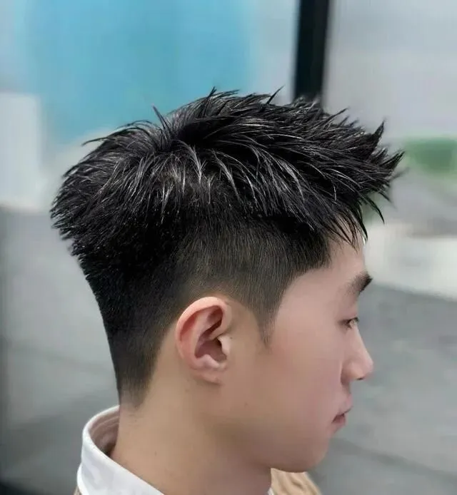 鬓角利落铲短,顶部头发向上抓出立体小刺,无厚重刘海;适合运动型男生、圆脸/方脸(显脸长);发泥抓发根+发胶定型,持久不塌。