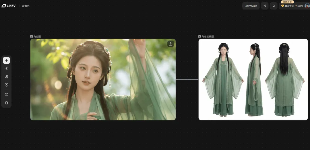 以前在 n8n 流程里,我们需要通过 Seed 值、LoRA 权重来反复“对齐”角色特征,稳定性全靠运气。LibTV 引入了角色三视图功能:直接生成标准的正面、侧面、背面视图。系统会将这些视图锁定为“锚点”,后续生成的所有分镜都会强行对齐这些特征向量。